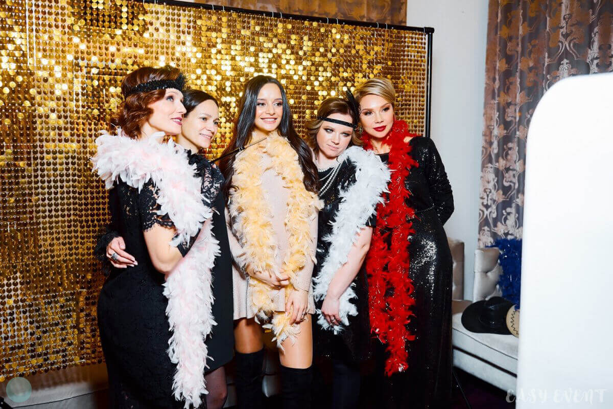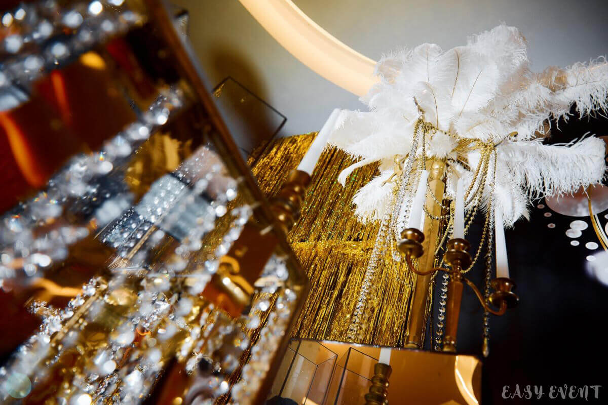 День рождения с энергичным характером для красавицы Анны. Стилем торжества мы выбрали эпоху джаза: увлекательное путешествие во времени в Америку начала ХХ века. Чтобы максимально передать атмосферу, наши декораторы использовали золотые элементы, перья, жемчуг и другие фишки того века. Гости приходили одеты по дресс-коду: блестящие платья, меховые изделия и аксессуары на голову и шею, соответствующие тематике.