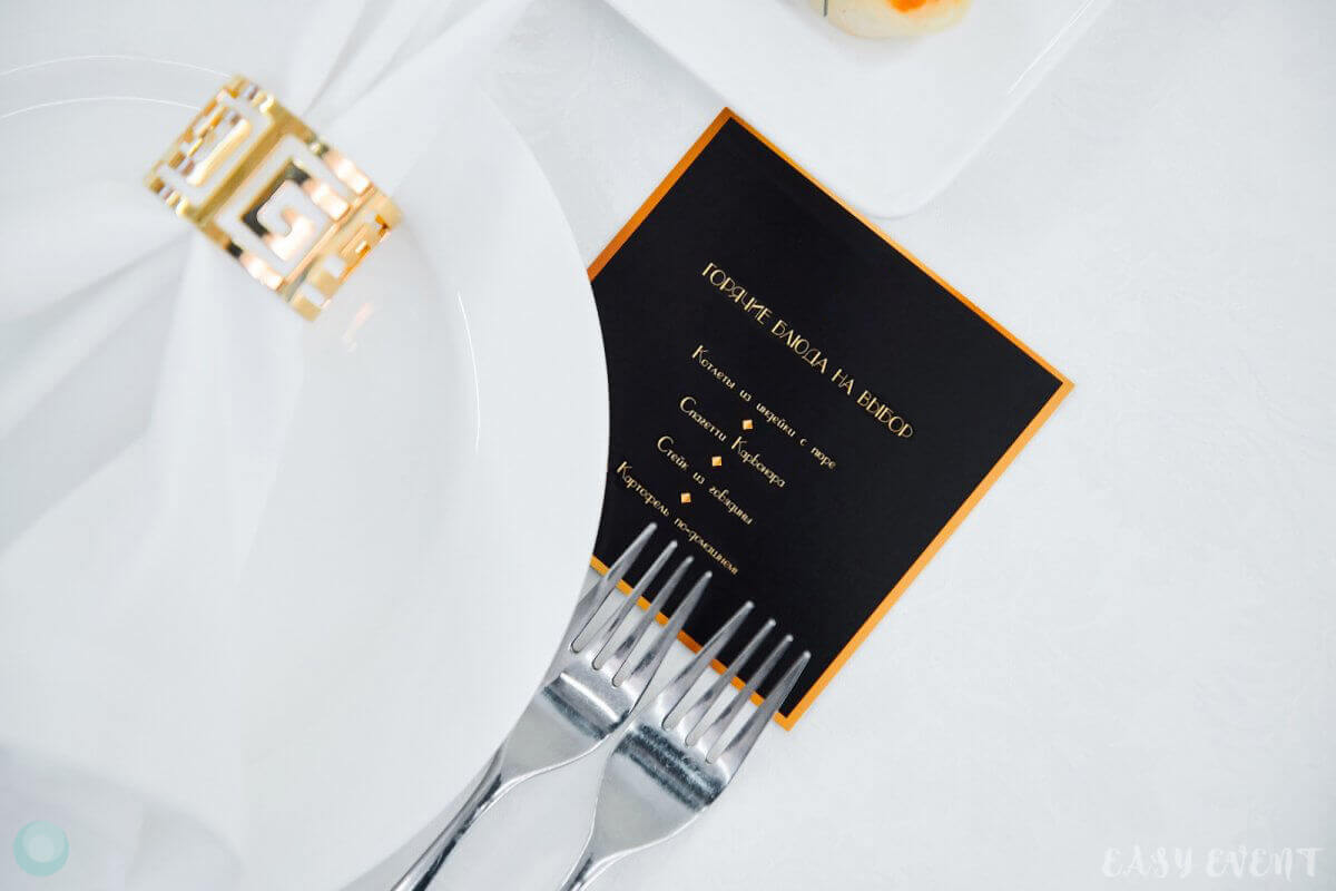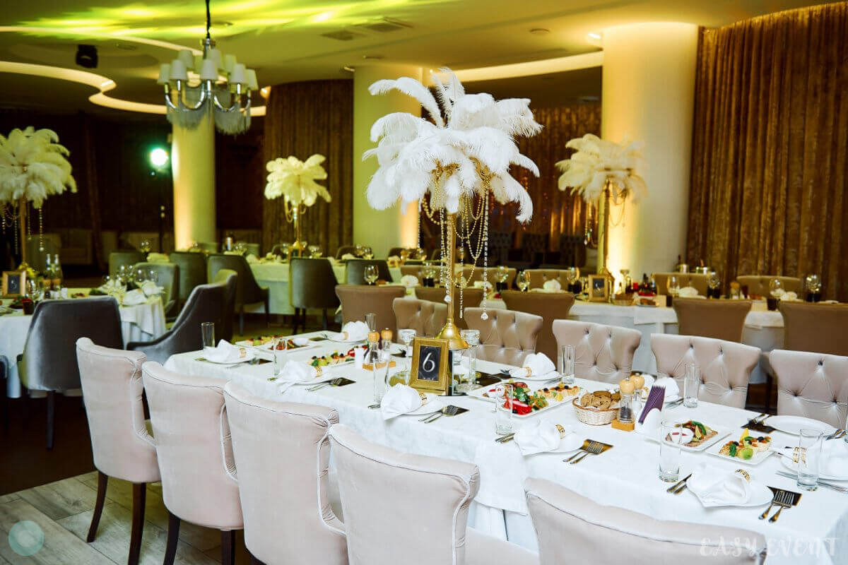 Зал мы украсили композициями из воздушных шаров в черном, белом и золотом цвете, на столах стояли высокие этюды из перьев и цепочек. Рассадка была классическая: за несколькими прямоугольными столами разместились все гости. Каждый сам определял место на этот вечер. На выбор предоставлялись горячие блюда в индивидуальном меню, оформленном в цвет праздника.