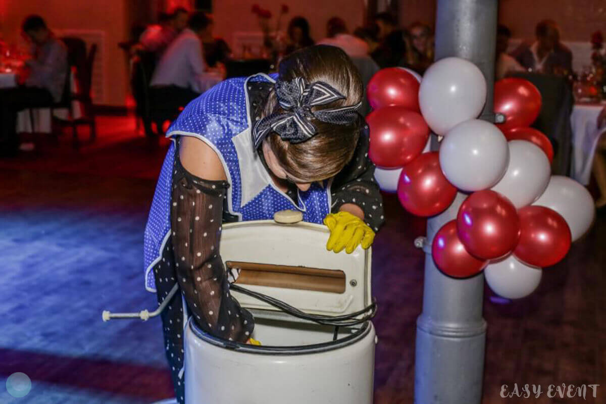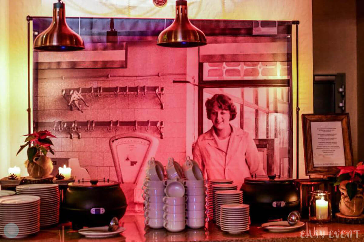 Особого внимания заслуживают оформление и развлечения: зал мы украсили шарами красного и белого цвета, по всему периметру устанавливались тематические предметы декора. Возле стола с горячими блюдами мы поставили традиционно советское изображение девушки за прилавком, а «персонал» обеспечили винтажными весами с тех времен. В конкурсах использовали тематические скатерти, стиральные машины, тазики и даже металлическую посуду на цепи.