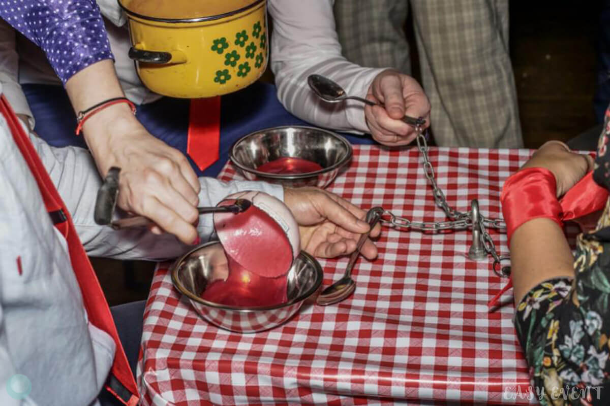 В этот вечер у каждого была своя роль и соответствующий ей костюм. Их мы подготовили заранее и выдали участникам корпоратива. Благодаря услугам кейтеринга, приготовили ключевые блюда советской кухни. Гости расположились возле сцены за длинным прямоугольным столом.