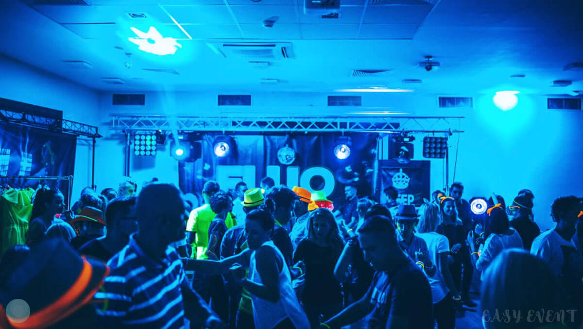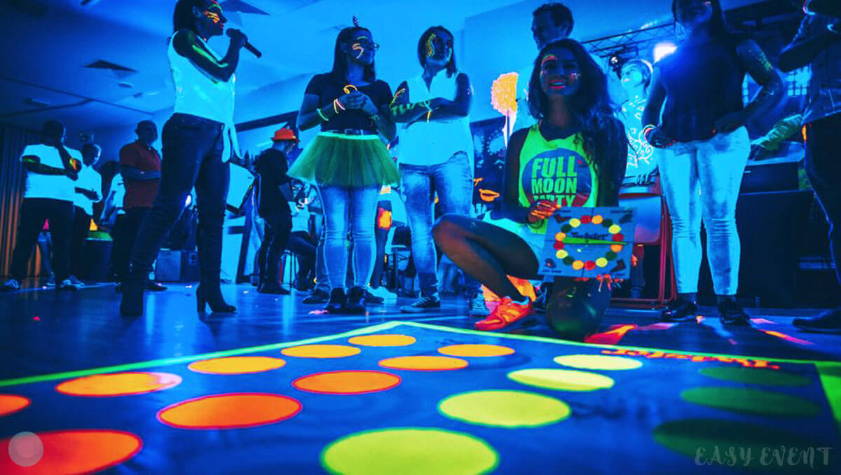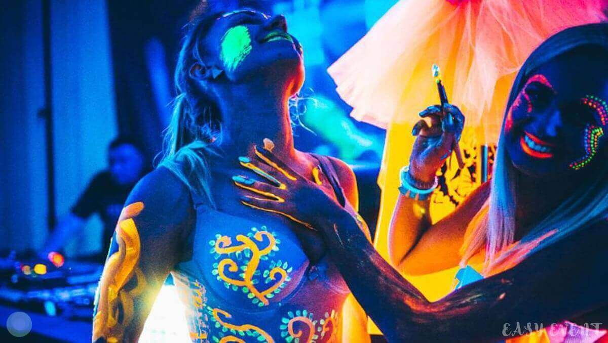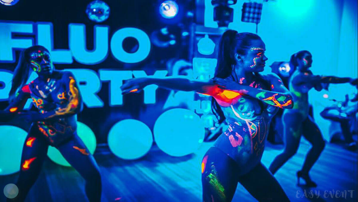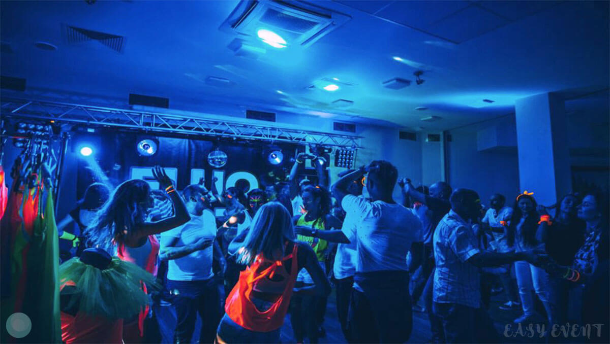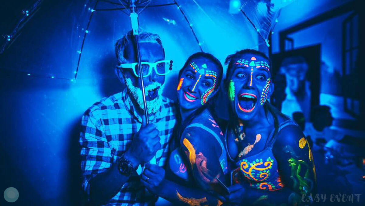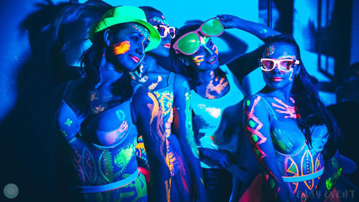 Развлекательная программа соответствовала тематике ивента. Всем желающим девушки делали неоновый аквагрим: разрисовывали лицо и тело разноцветными светящимися красками. Также на вечеринке работали профессиональный диджей, энергичный ведущий и зажигательные танцоры в пестрых костюмах.