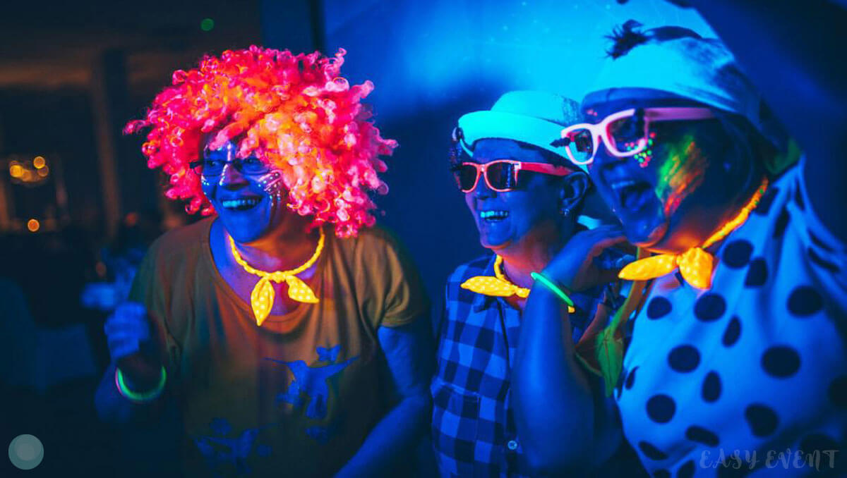 Наши декораторы оформили всё в неоновых цветах. Каждому гостю раздали яркую насыщенную атрибутику и аксессуары. Розовые, желтые, оранжевые, салатовые элементы одежды светились в ультрафиолете и создавали цветные вспышки во время танцев и веселья. Особенностью этого мероприятия было то, что гости могли сами заказывать себе любимые закуски и напитки из меню, а не довольствоваться тем, что подготовили для них организаторы.
