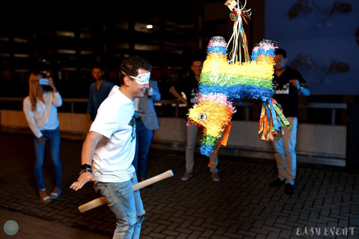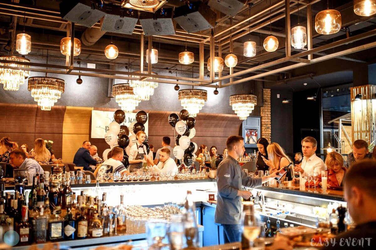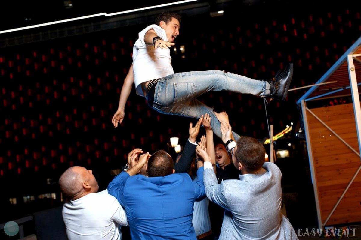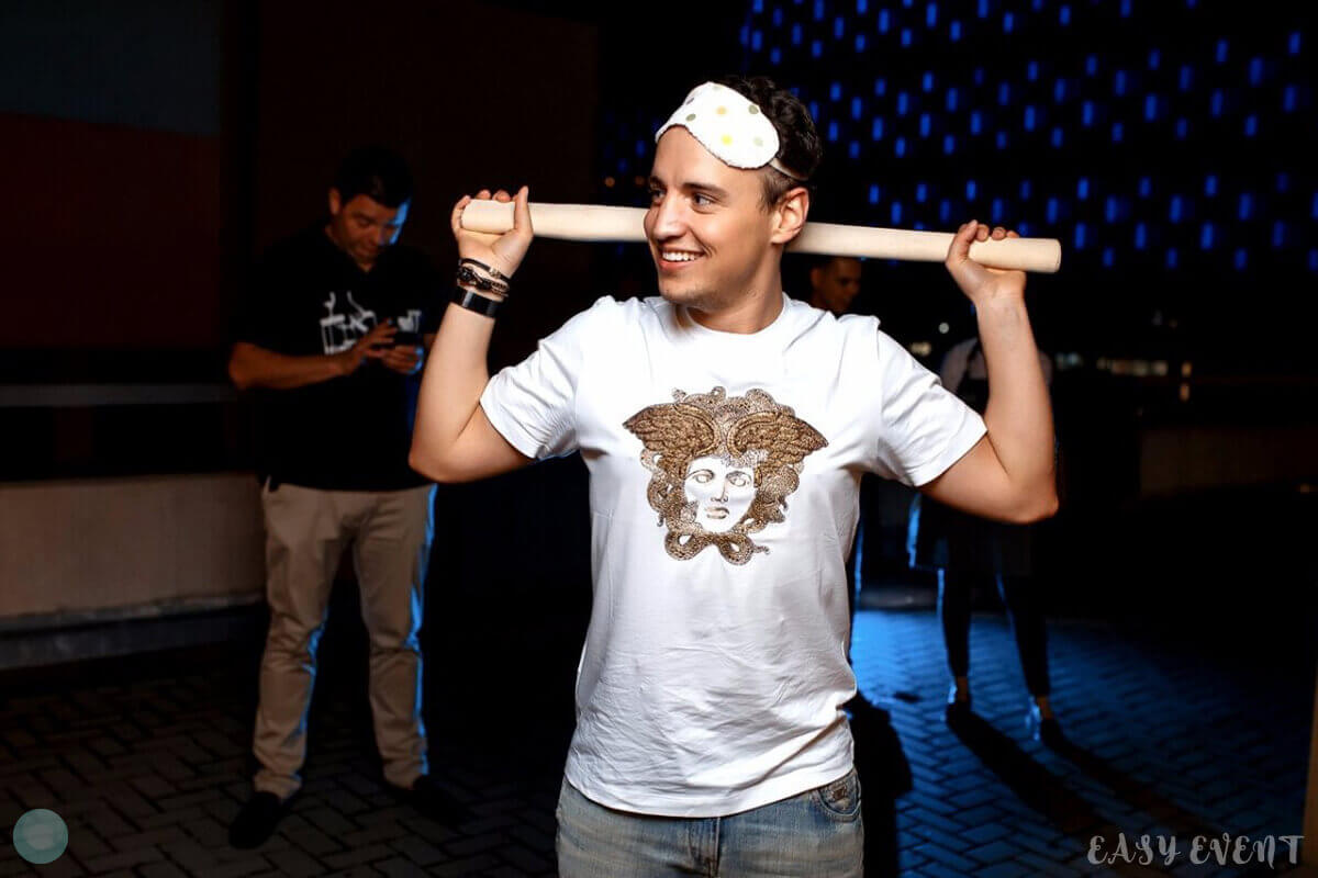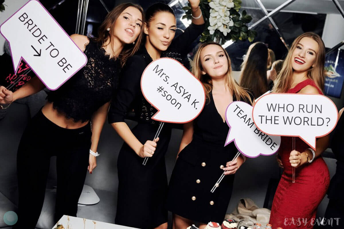 Праздник начался еще в машине, где было много алкоголя, заводная музыка и друзья пары. Действо продолжилось в баре-ресторане. Его мы украсили шарами, плюшевыми мишками, фотографиями в рамочках и атрибутикой для крутых снимков. Отдельным сюрпризом стала пиньята для жениха.