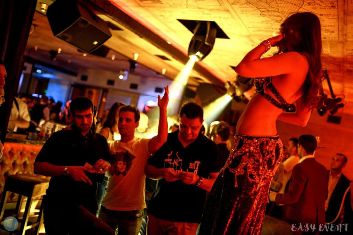 Гости наслаждались бармен-шоу с вкуснейшими коктейлями, угощениями европейской кухни, и хорошей музыкой. Для подружек невесты мы установили фотогеничный кендибар с милыми аксессуарами. Неожиданностью вечера стал яркий восточный танец прекрасных девушек в тематических нарядах. На организацию этой вечеринки у нас было всего две недели. Всё прошло ярко, стильно и со вкусом.